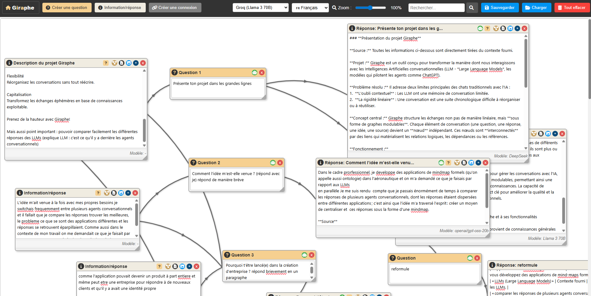 Giraphe structure les Ă©changes non pas de maniĂšre linĂ©aire, mais sous forme de graphes modulables. Chaque Ă©lĂ©ment de conversation (une question, une rĂ©ponse, une idĂ©e, une source) devient un nĆud indĂ©pendant. Ces nĆuds sont interconnectĂ©s par des liens qui matĂ©rialisent les relations logiques, les dĂ©pendances ou les rĂ©fĂ©rences.