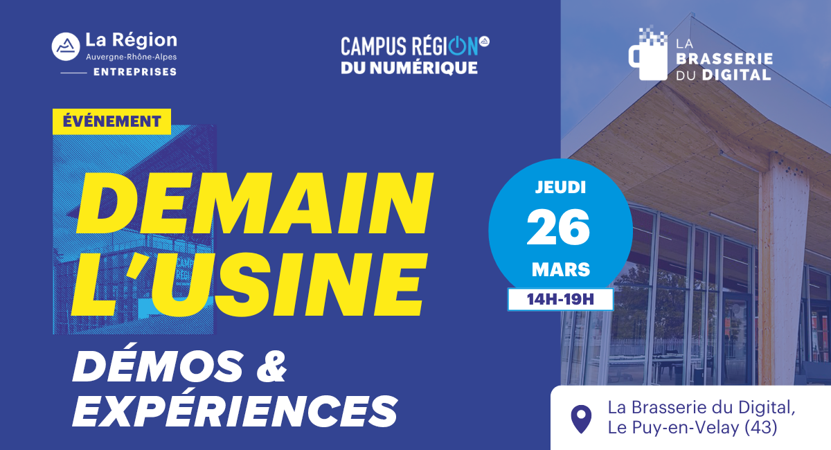 Le Campus RĂ©gion du numĂ©rique vous donne rendez-vous pour la 10e Ă©dition de Demain l’Usine le jeudi 26 mars ! Pour cette nouvelle Ă©dition, l’Ă©vĂ©nement se dĂ©place exceptionnellement Ă La Brasserie du Digital, en lien avec l’Agence Auvergne RhĂŽne-Alpes Entreprises.