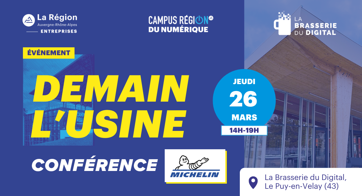 Le Campus Région du numérique vous donne rendez-vous pour la 10e édition de Demain l’Usine le jeudi 26 mars ! Pour cette nouvelle édition, l’événement se déporte exceptionnellement à La Brasserie du Digital, en lien avec l’Agence Auvergne Rhône-Alpes Entreprises.