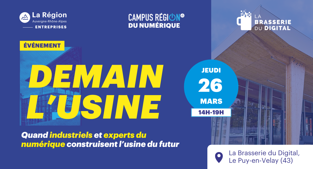 Le Campus Région du numérique vous donne rendez-vous pour la 10e édition de Demain l’Usine le jeudi 26 mars ! Pour cette nouvelle édition, l’événement se déporte exceptionnellement à La Brasserie du Digital, en lien avec l’Agence Auvergne Rhône-Alpes Entreprises.