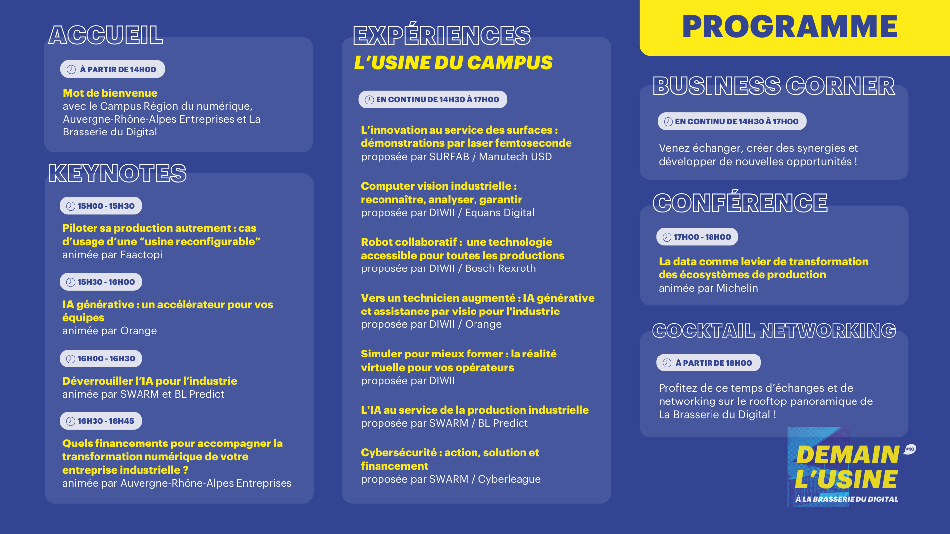 Les Mini-Keynotes permettront d’aborder l’usine reconfigurable et jumeau numérique, l’IA industrielle, la maintenance prédictive et les solutions de financement complètent ce panorama tourné vers l’agilité et la performance. Ceux-ci se tiendront dans notre espace de convivialité Le Comptoir.